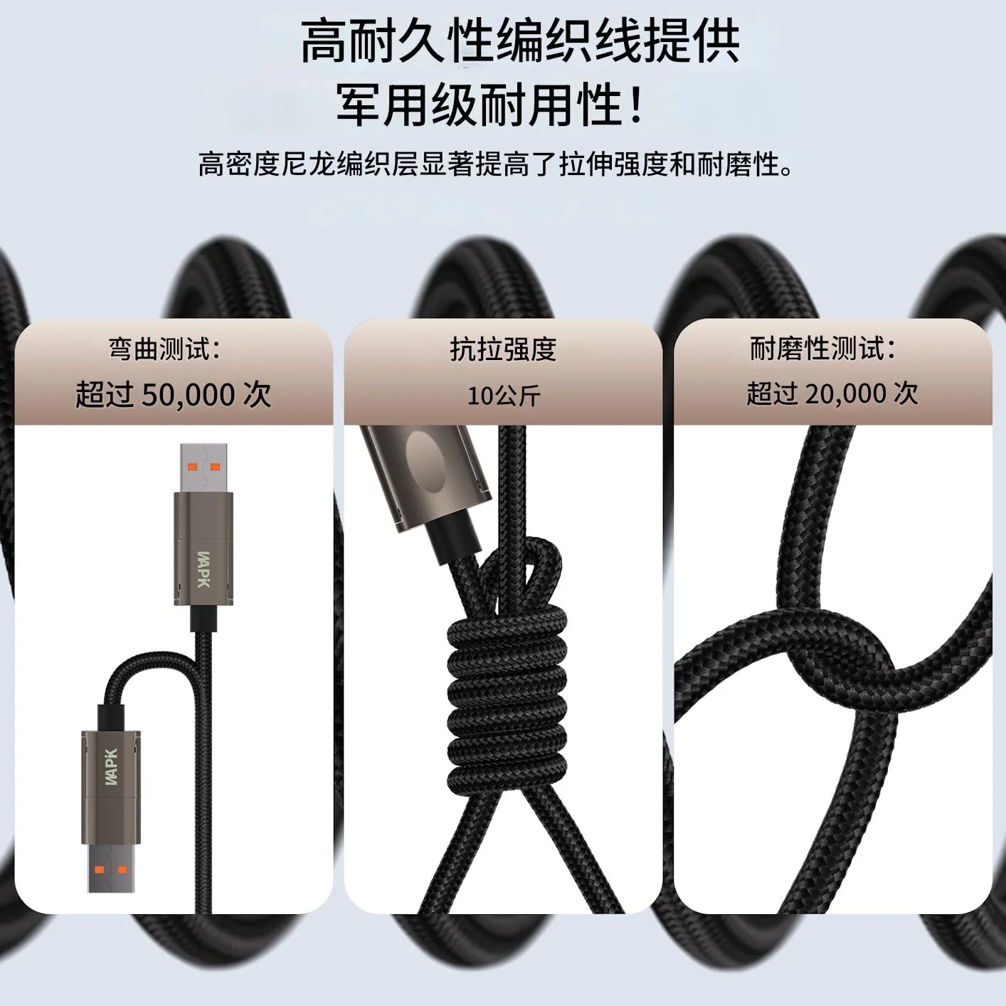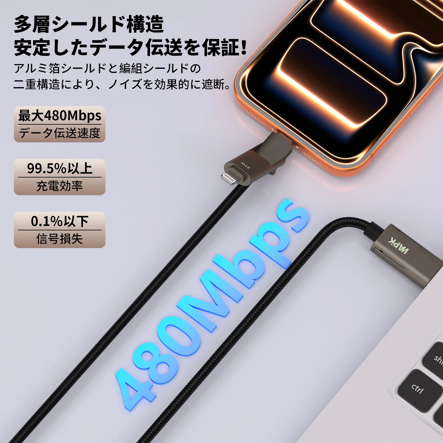 多層シールド構造+高純度太径銅芯を採用し、データ転送の安定性(480Mbps)、充電の高効率性(99.5%)、低損耗を実現。