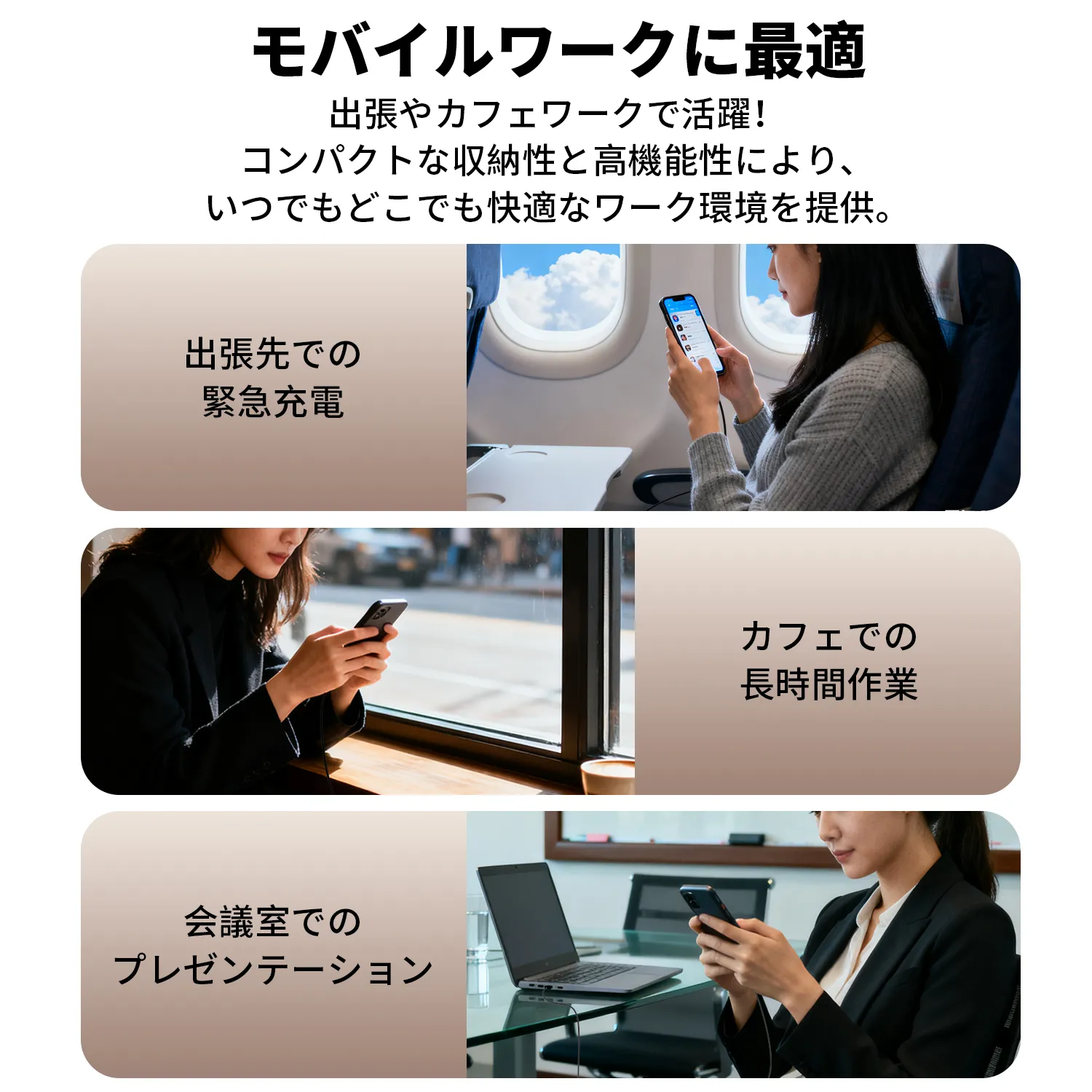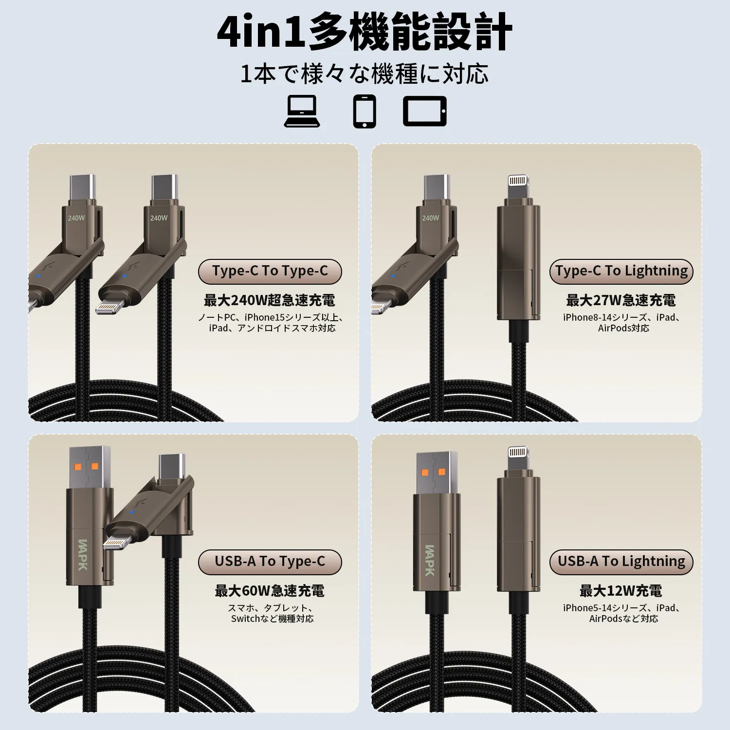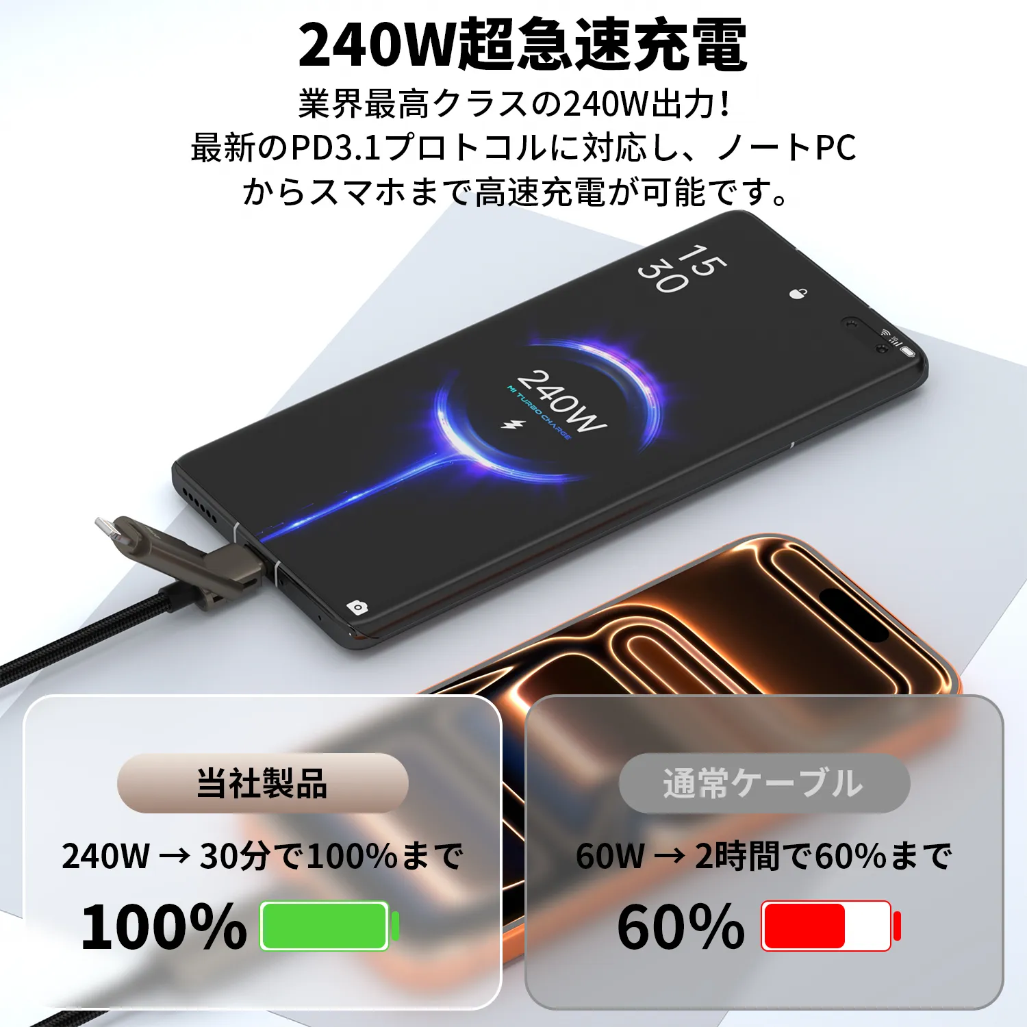 PD3.1 プロトコル対応の 240W 超急速充電に対応し、たった 30 分でデバイスをフル充電。同時にスマホ、タブレット、ノート PC など多機種に対応可能で、Type-C/USB-A から Lightning/Type-C へ 4 種類のインターフェースをワンタッチ切り替え。