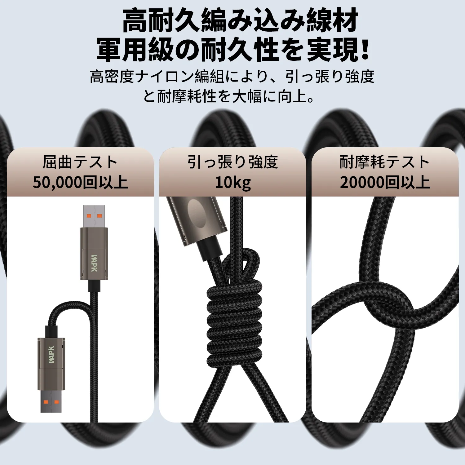 高密度編組ケーブル+マグネット式自動収納設計で、耐久性抜群(5 万回の折り曲げ耐久、10kg 耐引張り強度)かつワンタッチで整理可能。1.2m/2m の長さから選択可で、外出時の持ち運びも超便利。