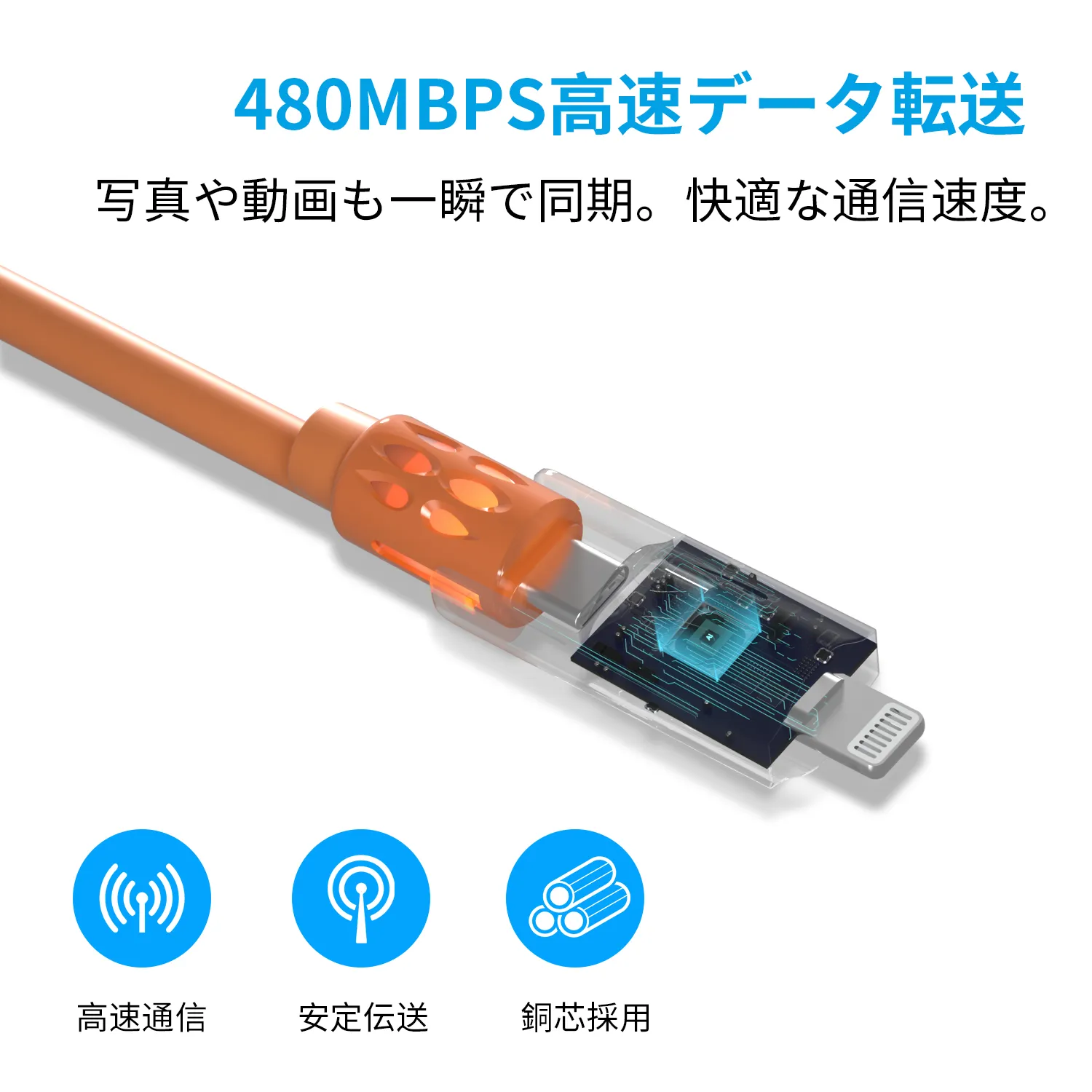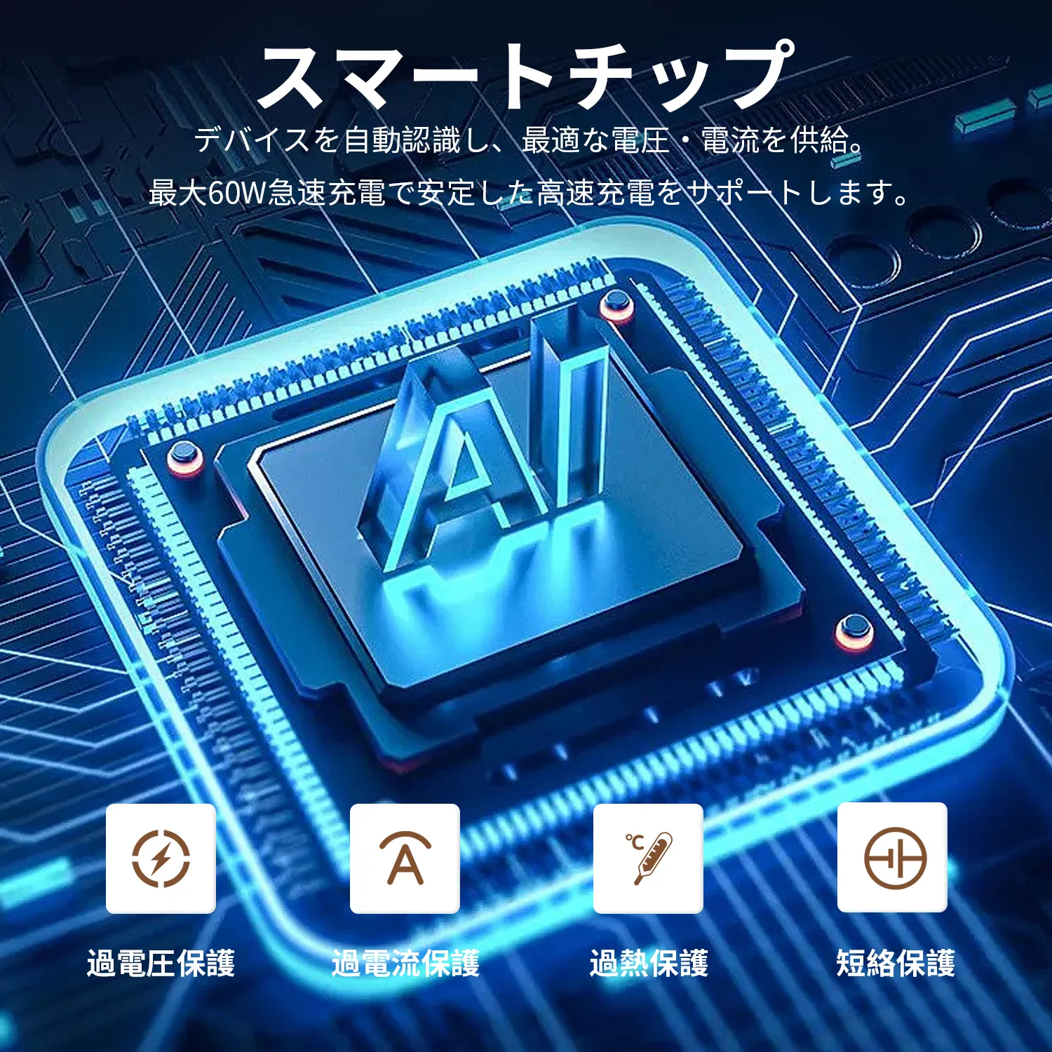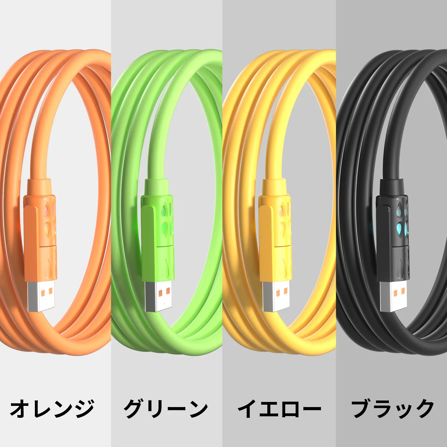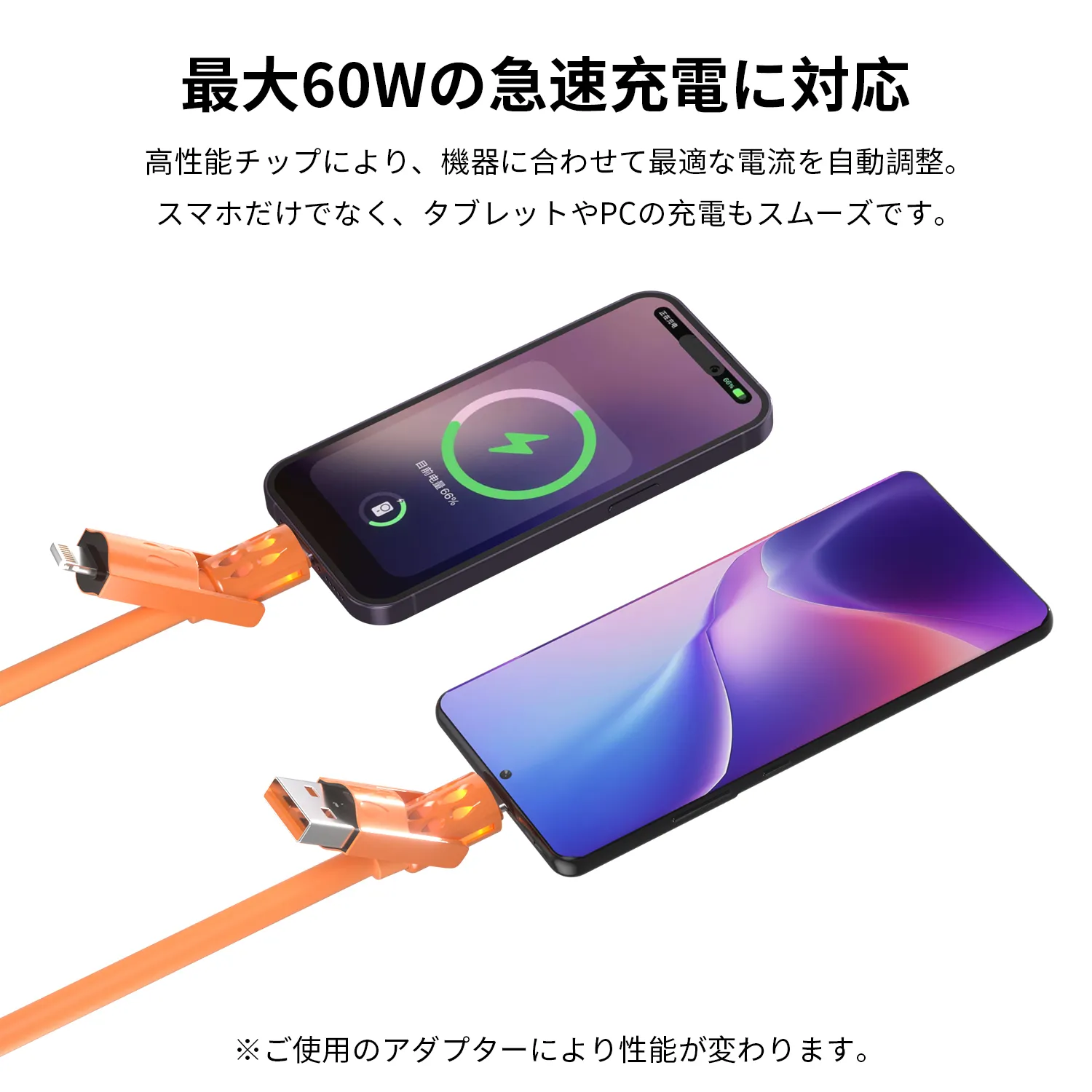 Wapik 4-in-1 フレグランス急速充電ケーブルは、USB-A、Type-C、Lightningなど複数のインターフェースを搭載し、スマートフォン、タブレット、PCなど、あらゆるデバイスに対応しています。高性能チップを内蔵し、60Wの急速充電と480Mbpsの高速データ転送に対応。充電と同時作業も快適に行えます。柔軟性の高いシリコン製で、爽やかな香りが漂い、充電中は柔らかな光を放ちます。3万回の屈曲試験に合格し、耐久性に優れています。