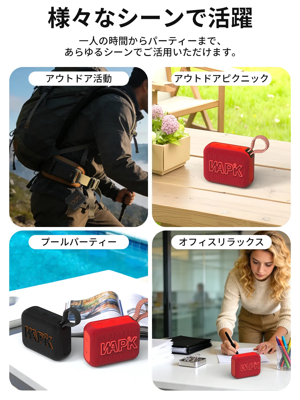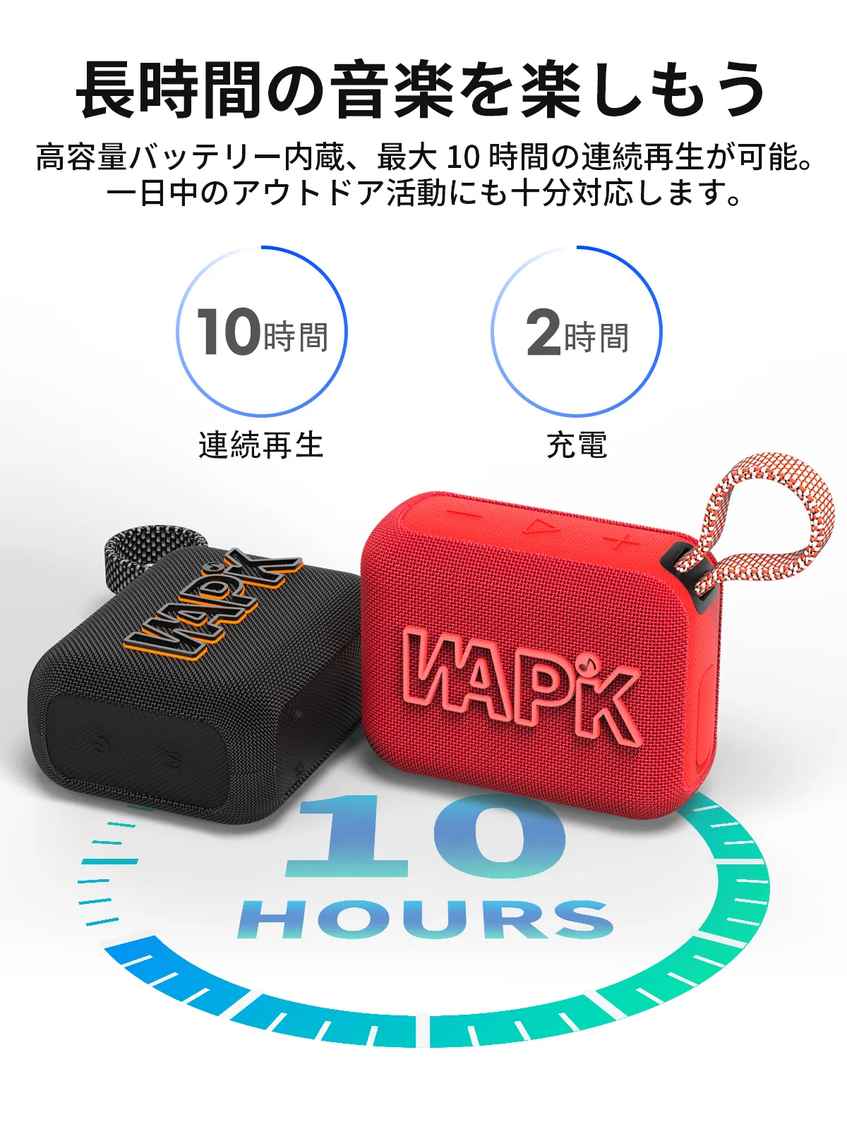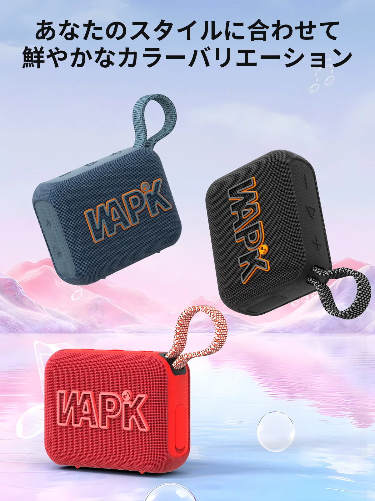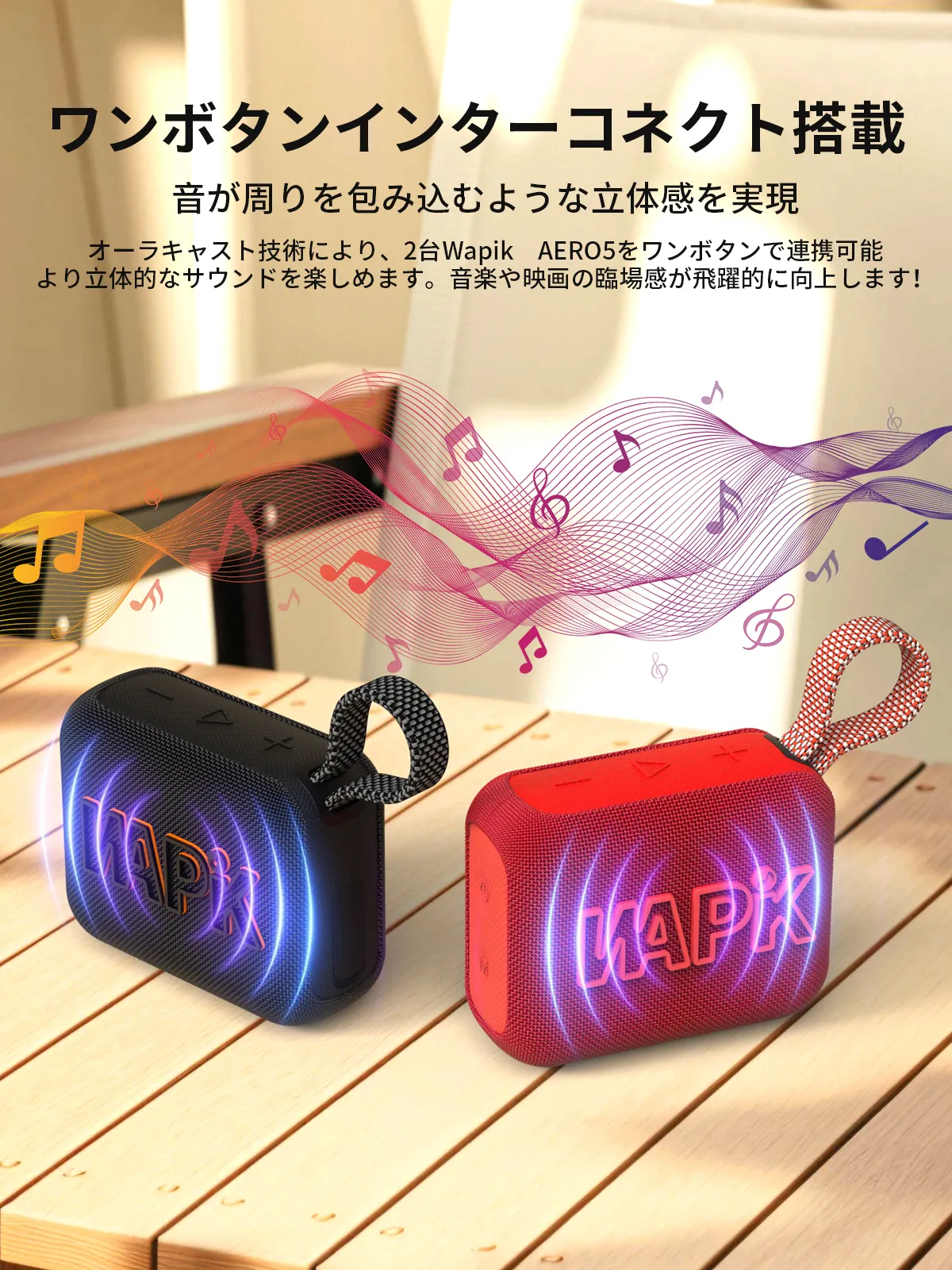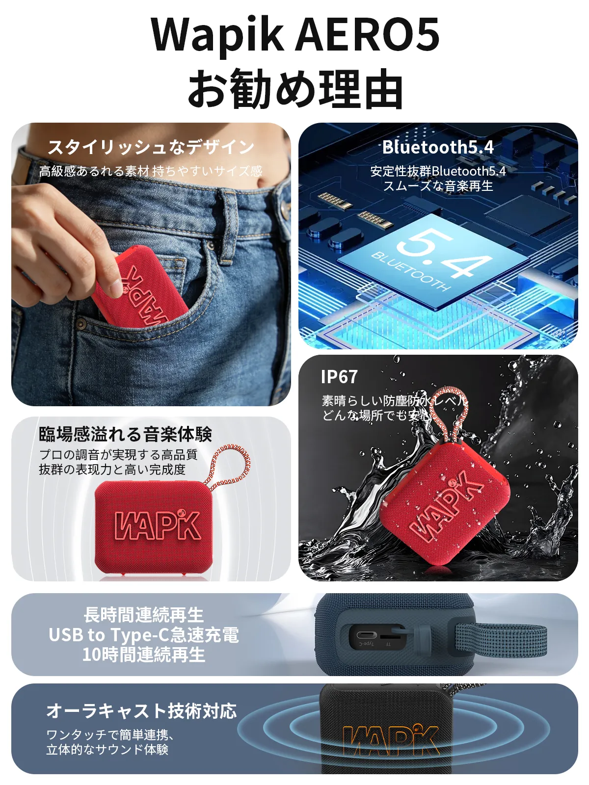 Wapik AERO5ポータブルスピーカーは、小型軽量で持ち運びに便利です。IP67の防塵・防水性能を備え、様々なシーンに対応します。安定したBluetooth 5.4接続、ステレオテクノロジー、プロフェッショナルチューニングによる高音質、10時間のバッテリー駆動時間、そして2時間の急速充電を誇ります。レッド、ブルー、ブラックの3色展開で、屋内でも屋外でも、いつでもどこでも没入感のある音楽をお楽しみいただけます。