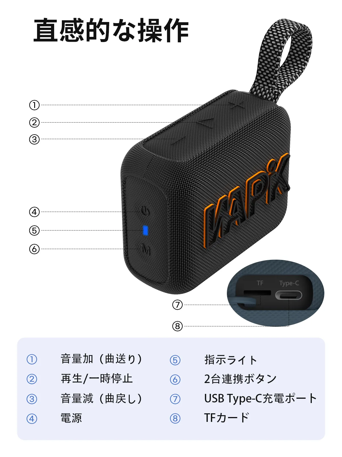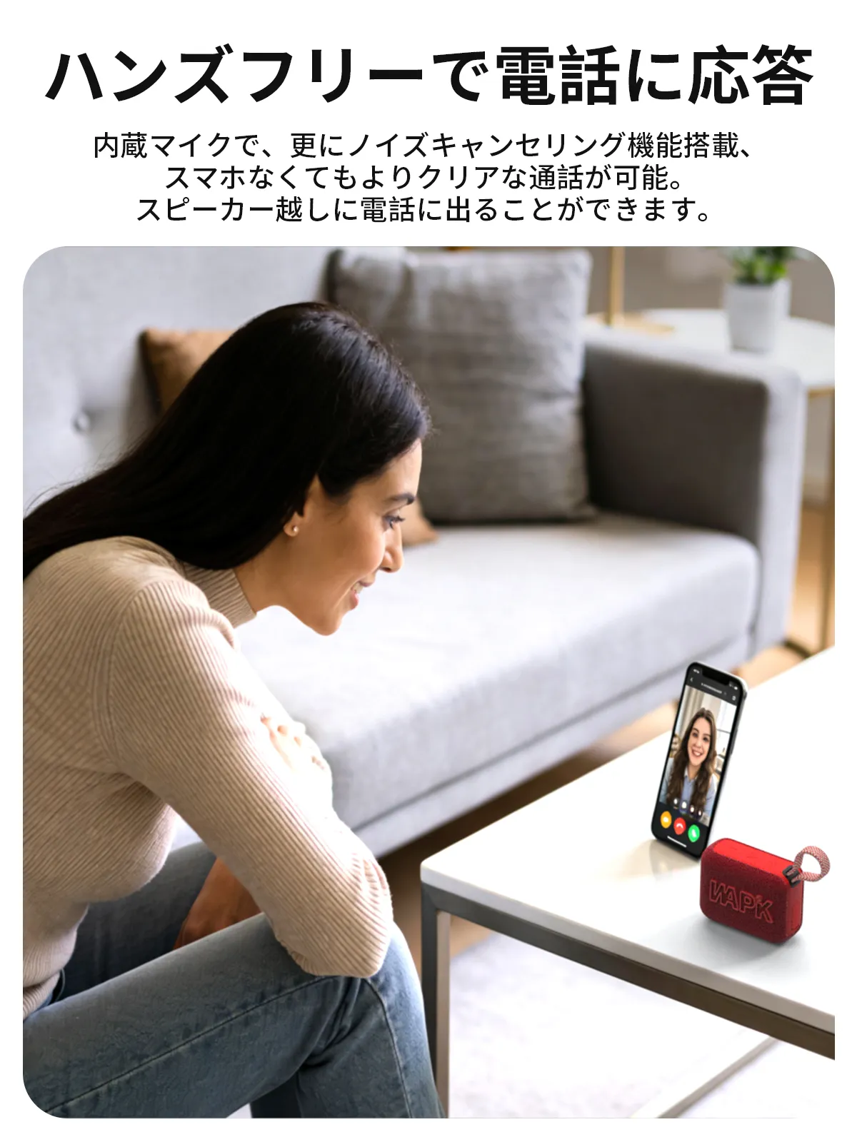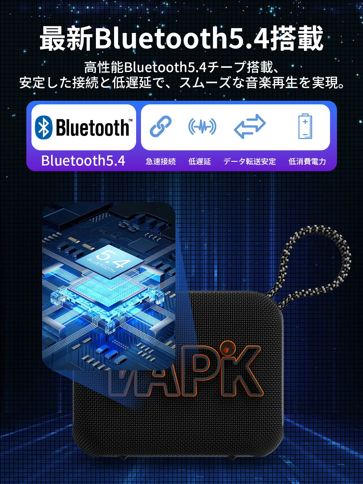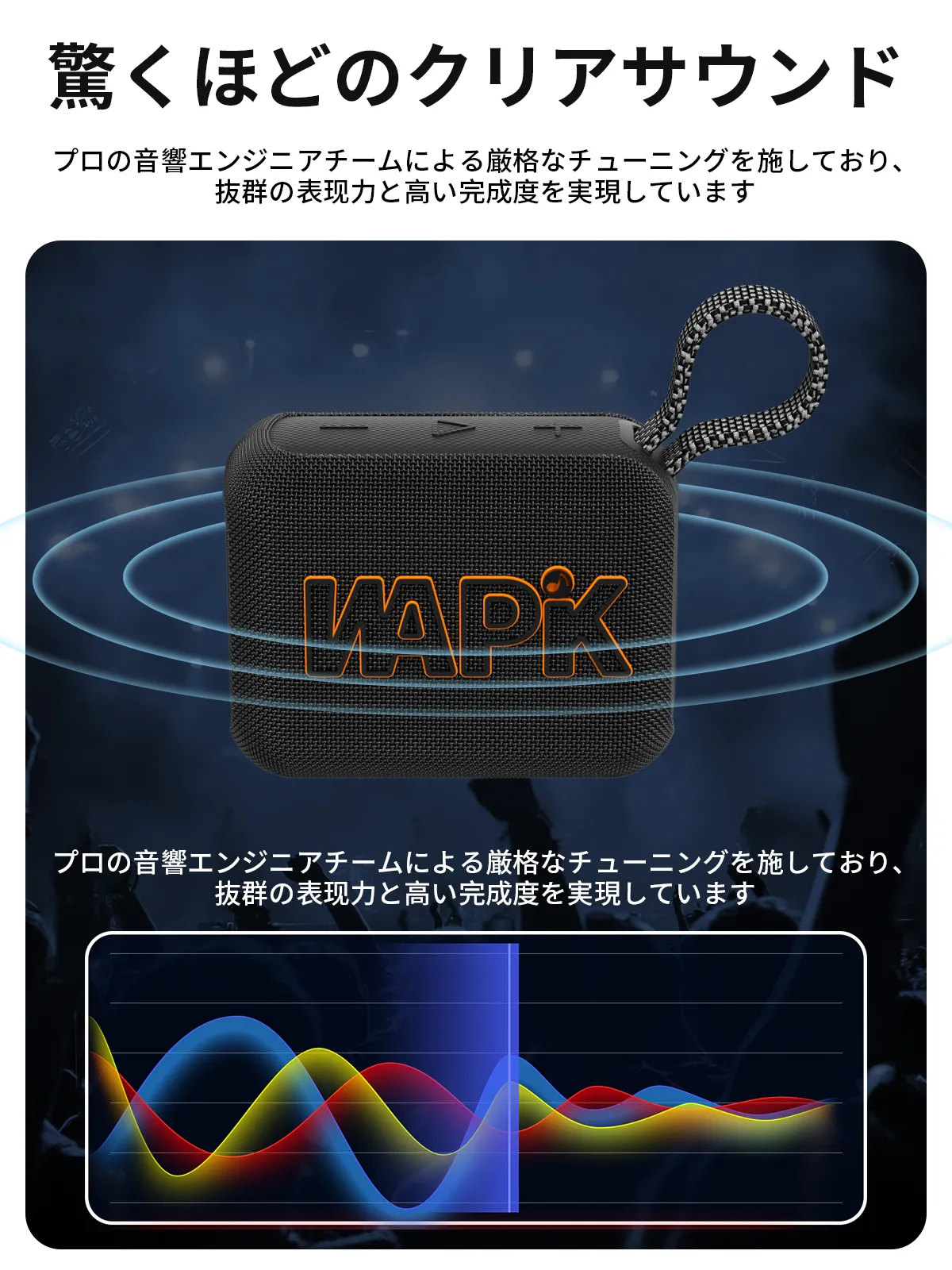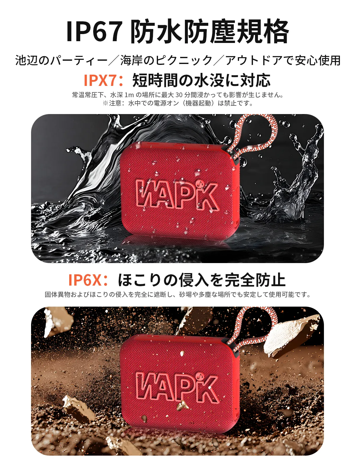 Wapik AERO5ポータブルスピーカーは、小型軽量で持ち運びに便利です。IP67の防塵・防水性能を備え、様々なシーンに対応します。安定したBluetooth 5.4接続、ステレオテクノロジー、プロフェッショナルチューニングによる高音質、10時間のバッテリー駆動時間、そして2時間の急速充電を誇ります。レッド、ブルー、ブラックの3色展開で、屋内でも屋外でも、いつでもどこでも没入感のある音楽をお楽しみいただけます。